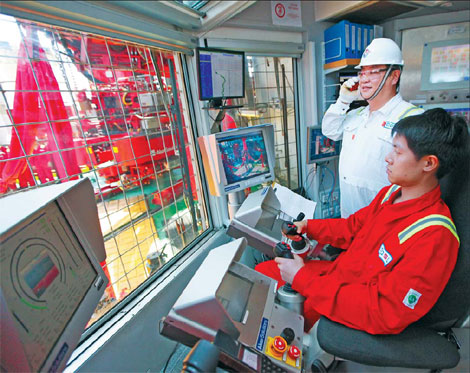 Workers testing equipment at the first made-in-China deepwater drilling rig - the Haiyangshiyou 981 semi-submersible deepwater rig - in the South China Sea. The rig has begun to drill a well in a part of the sea known as 43/11 block that is jointly being explored by China National Offshore Oil Corp, BP Plc and Anadarko Petroleum Corp. Photos by Zhao Liang / For China Daily