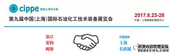 2017年8月23-25日,振威展覽股份主辦的第九屆上海國際石油化工技術裝備展覽會(cippe上海石化展)將在上海新國際博覽中心召開。浙江安構閥業(yè)有限公司將亮相展會,歡迎業(yè)內人士參展參觀。