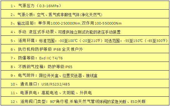 DG系列平行雙導(dǎo)向撥叉執(zhí)行器包括4個(gè)類型、6個(gè)等級(jí)共24個(gè)規(guī)格約200多個(gè)品種。輸出扭矩最大550000Nm、氣源壓力0.5MPa∽16MPa。配套閥門(mén)涵蓋放空閥2"∽ 56" Class900管線球閥的應(yīng)用要求。該公司產(chǎn)品廣泛用于石油、天然氣項(xiàng)目和長(zhǎng)輸管線。