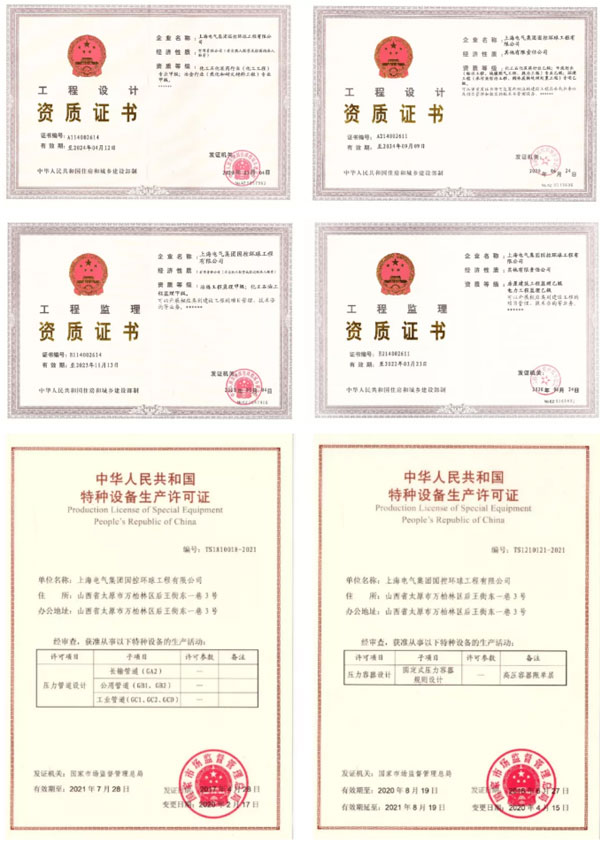 上海電氣化工產(chǎn)業(yè)及相關(guān)產(chǎn)品資質(zhì)證書齊全,擁有化工石化醫(yī)藥行業(yè)(化工工程)、冶金行業(yè)(焦化和耐火材料)工程設(shè)計(jì)專業(yè)甲級(jí)資質(zhì);化工石油工程、冶煉工程監(jiān)理甲級(jí)資質(zhì);工程咨詢資信評(píng)價(jià)化工、石化、醫(yī)藥專業(yè)甲級(jí)資質(zhì);化工石化醫(yī)藥行業(yè)乙級(jí)、市政行業(yè)(城鎮(zhèn)燃?xì)?、熱力工程、給水工程)工程設(shè)計(jì)專業(yè)乙級(jí)、環(huán)境工程(水污染防治工程、固體廢物處理處置工程)工程設(shè)計(jì)專項(xiàng)乙級(jí)資質(zhì);房屋建筑工程、電力工程監(jiān)理乙級(jí)資質(zhì)等。