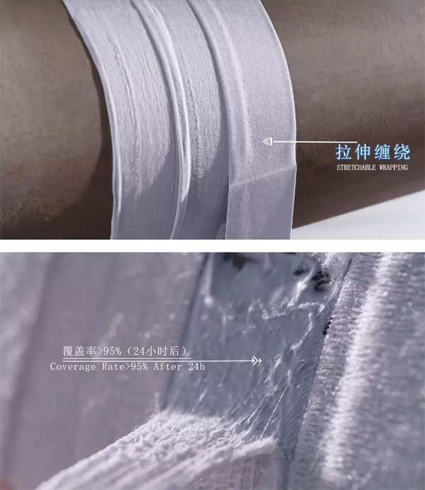 那么冷流特性對于防腐來說有什么具體的意義呢?我們知道,對于管道外防腐層來說,最主要的防腐方式就是通過隔絕管道表面的空氣和水分來達(dá)到防腐的目的,但是管道的微觀表面并不是完全平整的,將其放大來看,管道表面呈現(xiàn)的是凹凸不平的狀態(tài),那么對于常規(guī)的纏繞式膠帶來說,由于其不具備冷流特性,膠帶與管道表面波谷的位置無法形成有效粘結(jié)導(dǎo)致粘結(jié)效果大幅度降低,隨著時(shí)間推移,膠層與基材脫粘失效,而冷流特性可以保證新型防腐材料在外力作用情況下放大冷流的優(yōu)勢,使膠層充分填滿管道表面的凹坑,并且隨著時(shí)間的推移粘結(jié)效果會(huì)越來越好,從而徹底隔絕空氣和水分,延長防腐材料的使用壽命。