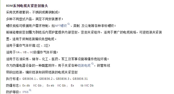 公司專業(yè)生產(chǎn)電纜密封接頭、防爆撓性連接管、防爆填料函,防爆管件等產(chǎn)品。嚴(yán)格按照ISO9001質(zhì)量管理體系組織生產(chǎn)、形成了從研發(fā)、生產(chǎn)到成品等各個(gè)環(huán)節(jié)品質(zhì)的保證。產(chǎn)品廣泛用于石化,海油,平臺(tái),化工,醫(yī)藥,煤礦,煉鋼,船舶,軍工等領(lǐng)域,過(guò)硬的品質(zhì)獲得國(guó)內(nèi)外客戶的一致好評(píng)。