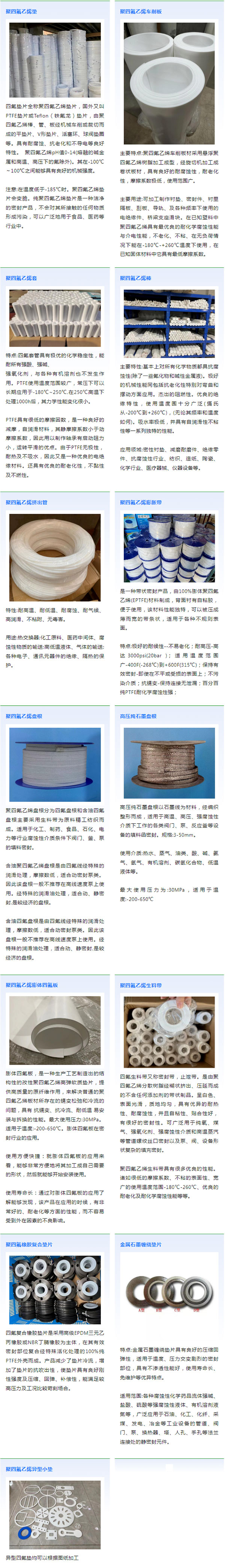 公司產(chǎn)品主要用于國防、化工、制藥、造紙、電力、機(jī)械、防腐管道等。主要生產(chǎn)、經(jīng)營:四氟制品、四氟墊、板、棒、管、推壓管、推壓棒、四氟生料帶、四氟彈性帶、黑四氟墊、四氟擋圈、四氟O形圈、石墨增強(qiáng)復(fù)合墊、石墨墊、金屬纏繞墊片、齒型墊、石棉板墊、透鏡墊、八角墊、紫銅墊、石墨盤根、四氟盤根、芳綸盤根、高水基盤根、石棉盤根等。