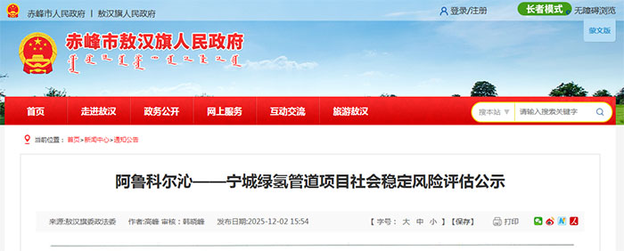 12月2日,赤峰市敖漢旗人民政府發(fā)布《阿魯科爾沁——寧城綠氫管道項(xiàng)目社會穩(wěn)定風(fēng)險評估公示》。