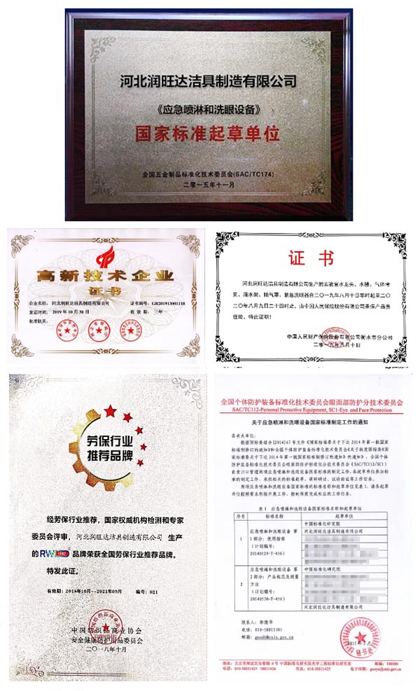 經(jīng)過多年發(fā)展,潤旺達公司斥資建立了同行業(yè)少有的產(chǎn)品檢測中心,擁有光譜分析儀、鹽霧測試機、壽命測試機、水壓密封測試機、氣密測試機、強度測試機、流量測試機等多臺先進檢測設(shè)備,構(gòu)建高效的企業(yè)研發(fā)和產(chǎn)品檢測體系,參與起草制定了《GB/T38144.2-2019應(yīng)急噴淋和洗眼設(shè)備》國家標準,并以先進的研發(fā)體系,申請獲得了多項洗眼器專利證書,滿足并超越洗眼器行業(yè)需求。